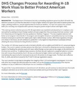 12月23日,美國國土安全部(DHS)與移民局(USCIS)正式確認了一項重磅移民改革: H-1B 從傳統隨機抽簽製切換為按工資水平加權抽簽改革方案(Final Rule)。