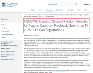 本輪抽簽是為了達到2025財年的H-1B普通名額(regular cap)上限,將進行第二輪隨機選擇。這次選擇將從之前提交的電子註冊中選出額外的獨特受益人,並通知被選中的申請者。
